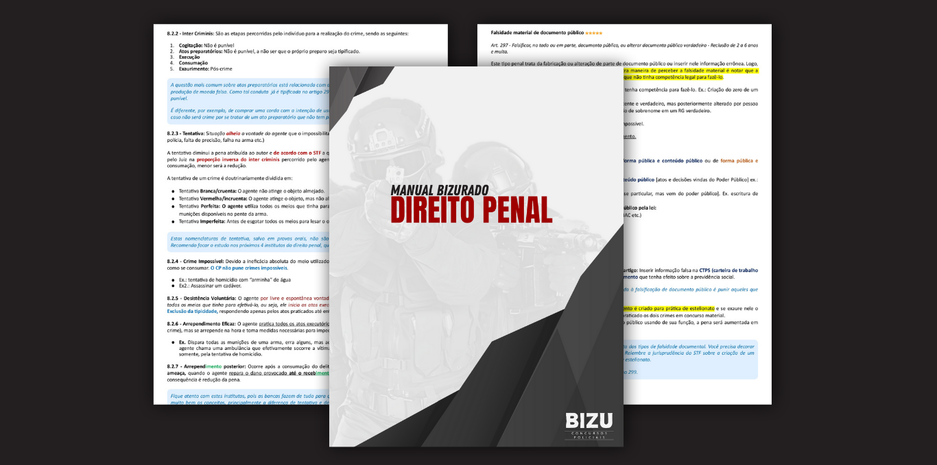 Você pode evitar tudo isso com o Manual Bizurado de Direito Penal. Este material é a garantia de que estudará tudo que é relevante para seu concurso, sabendo em quais pontos deve focar seus esforços e, o melhor, fazer isso em apenas 2 dias.